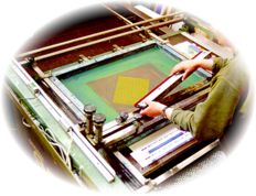 The dried screen is clamped into the master frame and located in position on the material to be printed. Each colour will have its own screen and be printed in sequence. This is why an accurate registration of each colour is crucial to the overall print. |